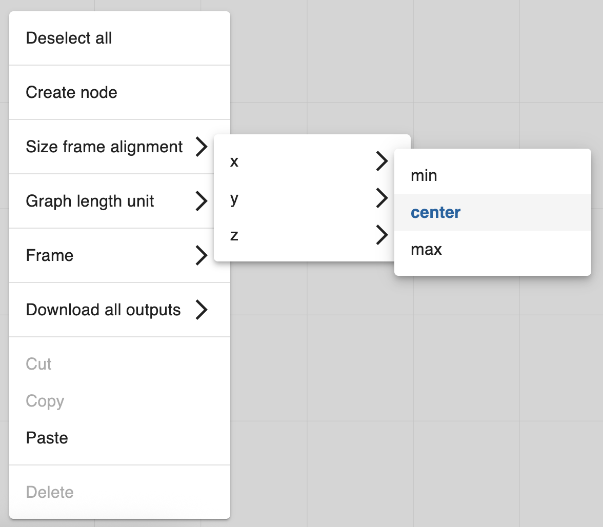 To set the alignment of a size frame, right-click the background of the graph (no nodes or connections) and navigate to the "Size frame alignment" menu option. There are three options: x, y, and z, each with three options: min, center, and max; each will align the size frame by its extents to the world center / 0,0,0.