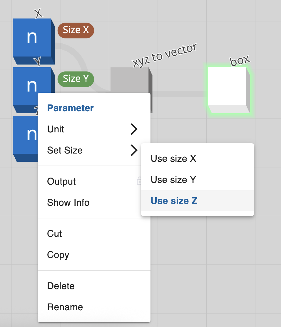 Only either a parameterized number node or parameterized integer node will be able to have a size frame's axis bound to it. To bind a particular axis of a size frame to a particular parameter, right-click a parameterized node and navigate to the "Set Size" menu option. There are three options: Use size X, Use size Y, and Use size Z; each will bind the parameterized node to its respective axis.